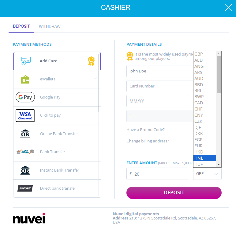 Nuvei provides an option for a user to open Nuvei’s Payment Page during a game or throughout a bet in case the user does not have enough balance to complete a needed action. With this solution, the user can determine their balance during a game or bet via a saved payment card account instead of having to leave the game or bet to determine the balance from the cashier.