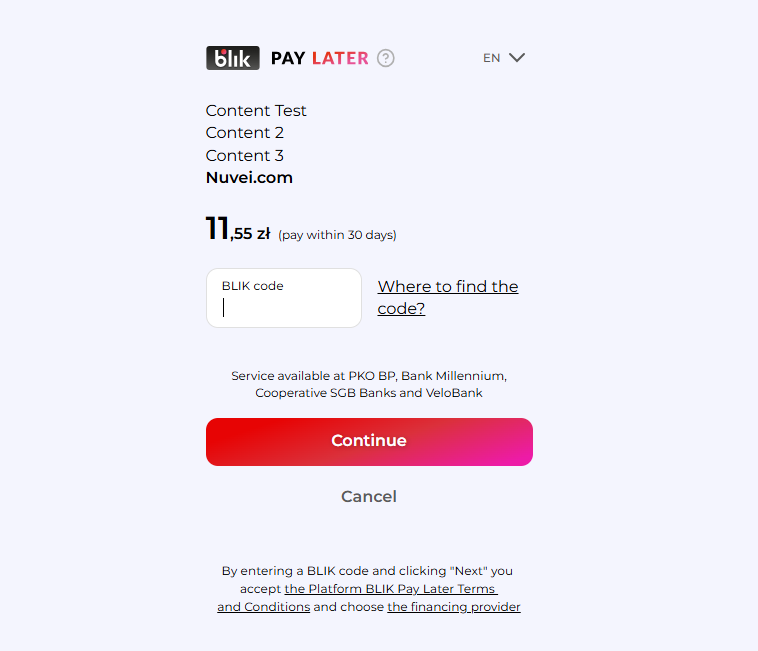 - Include the text ‘The BLIK Pay Later service is available to customers of PKO BP, Bank Millennium, SGB and VeloBank.’
