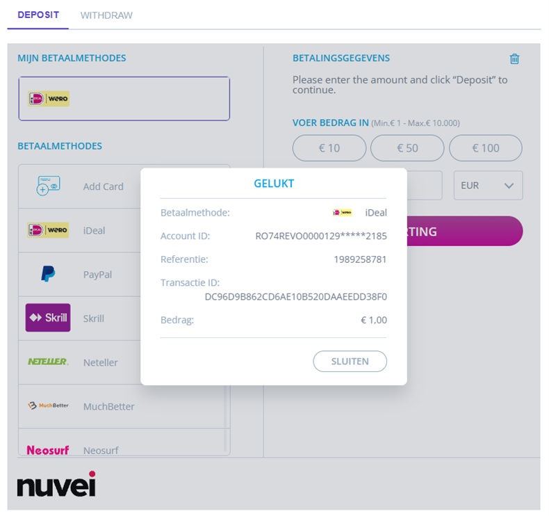 ...'ppp_status=OK&Status=APPROVED&ExErrCode=0&ErrCode=0&errApmCode=0&errApmDescription=&errScCode=0&errScDescription=&Reason=&ReasonCode=0&PPP_TransactionID=350763428&userid=Johnsmith01&merchant_unique_id=20180327175242&customData=&productId=&first_name=John&last_name=Smith&email=JohnS%40test.com¤cy=EUR&clientUniqueId=20180327175242&customField1=&customField2=&customField3=&customField4=&customField5=&customField6=&customField7=&customField8=&customField9=&customField10=&customField11=&customField12=&customField13=&customField14=&customField15=&invoice_id=&address1=Test+Street&address2=&country=Netherlands&state=&city=Yambol&zip=80410100&phone1=11111122200&phone2=&phone3=&client_ip=127.0.0.1&nameOnCard=&cardNumber=&bin=&noCVV=&acquirerId=&acquirerBank=Nuvei-PI&expMonth=&expYear=&Token=&tokenId=&AuthCode=NL96SNSB0115541241&AvsCode=&Cvv2Reply=&shippingCountry=&shippingState=&shippingCity=&shippingAddress=&shippingZip=&shippingFirstName=&shippingLastName=&shippingPhone=&shippingCell=&shippingMail=&total_discount=0.00&total_handling=0.00&total_shipping=0.00&total_tax=0.00&buyButtonProductBundleId=&merchant_site_id=224428&merchant_status=&action=&requestVersion=&message=APPROVED&merchantLocale=&unknownParameters=&payment_method=apmgw_iDeal&ID=&merchant_id=2439523627382132721&responseTimeStamp=2023-01-17.14%3A36%3A59&buyButtonProductId=&webMasterId=&appliedPromotions=&uniqueCC=&transactionType=Sale&externalEmail=&cardCompany=&eci=&user_token_id=Johnsmith01&userPaymentOptionId=86068558&TransactionID=711000000019066750&externalTransactionId=15135257&APMReferenceID=0EB03ABD418AA8EC8D2F0954946C8080&orderTransactionId=1177415928&totalAmount=100.00&dynamicDescriptor=test&item_name_1=NA&item_number_1=&item_amount_1=100.00&item_quantity_1=1&item_discount_1=0.00&item_handling_1=0.00&item_shipping_1=0.00&feeAmount=&amountWithoutFee=&houseNumber=&customCurrency=&upoRegistrationDate=20230117&type=DEPOSIT&clientRequestId=20230117093549&relatedTransactionId=&apmPayerInfo=%7B%22StatusInfo%22%3A%22%7B+StatusCode%3A+%2C+info%3A+%2C+originalAmount%3A+100.0000%2C+ProcessedAmount%3A+100%7D%22%2C%22AccountNumber%22%3A%22NL96SNSB0115541241%22%2C%22AccountHolder%22%3A%22Hr+E+G+H+K%C3%BCppers+en%2Fof+MW+M.J.+K%C3%BCppers-Veeneman%22%7D&sessionId=027ad1c105e3f9ae06ca3b464c0e&responsechecksum=de9a2addf8c6191824e549e5b6e9a1c1d58df1ed28c5b46c0f966b139ce15afa&advanceResponseChecksum=8337eda0641cff8c340ec6037adb092f27cf37dcbd8943ed7a30cc777acbcc26',