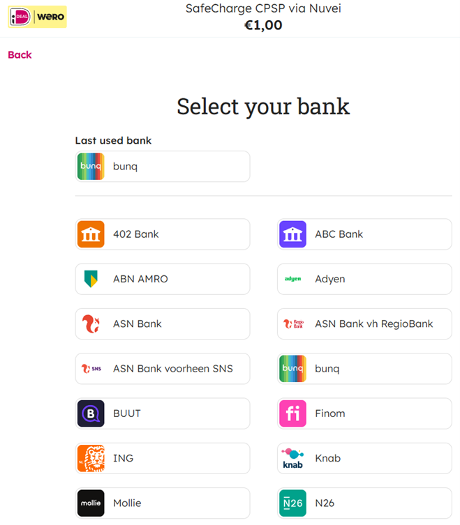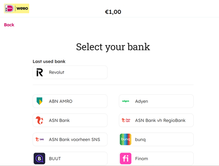 BIC:Bank Name BIC ABN AMRO ABNANL2A ASN Bank ASNBNL21 Bunq BUNQNL2A ING INGBNL2A Knab KNABNL2H N26 NTSBDEB1 Nationale-Nederlanden (NN) NNBANL2G Rabobank RABONL2U RegioBank RBRBNL21 Revolut REVOLT21 SNS Bank SNSBNL2A Triodos Bank TRIONL2U Van Lanschot Bankiers FVLBNL22 Yoursafe BITSNL2A - After selection by the Consumer of the bank, the Consumer should be immediately redirected to the Issuer