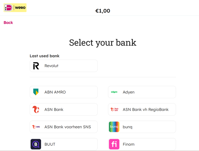 redirectURL. - All iDEAL banks must be shown in a list (e.g. dropdown list or list of radio buttons) in alphabetic order.