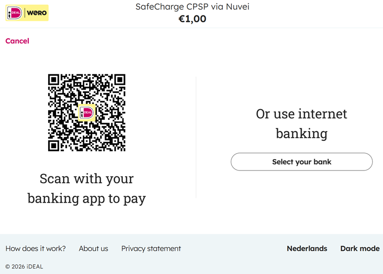 - The user is redirected to the iDeal website where the user scans the QR code directly with a banking app or manually selects a bank.