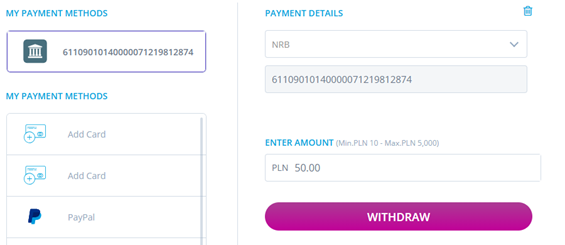 1. The user selects the payment method, enters an IBAN/NRB, and a withdrawal amount, then clicks ‘Withdraw’.
