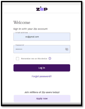 - The customer is redirected to a Zip screen to log into the Zip account.