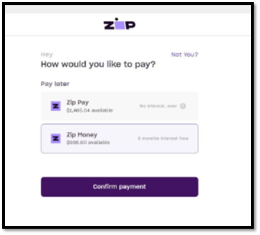 - The customer selects a payment method via Zip Pay or Zip Money.