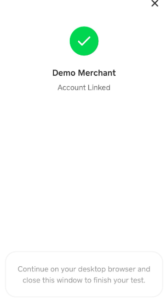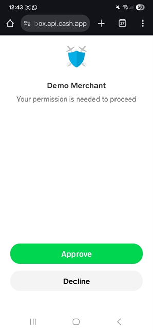 The customer links a Cash App account and approves the storages of payment credentials. The merchant receives an ID for use for future transactions. Payments can be approved using the stored grant, thus reducing friction for returning customers.