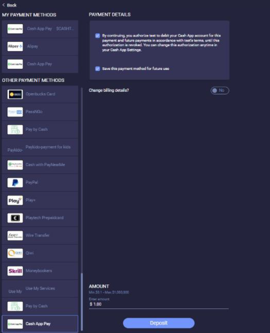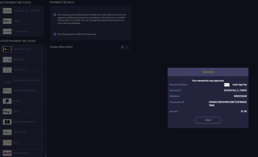 1. To select the on file flow, the user selects the ‘Cash App Pay’ payment option in the cashier and in ‘Payment Details’ marks the checkboxes.