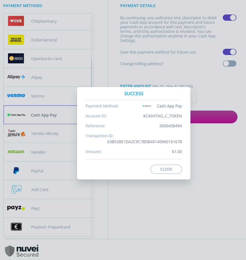 /paymentsRequest{ "processingEntityId": "<<processingEntityId>>", "amount": 10.5, "currency": "USD", "transactionType": "Sale", "paymentOption": { "alternativePaymentMethod": { "name": "cashApp", "usageIntent": "recurring" } }, "custom": { "description": "Some description" }, "deviceDetails": { "ipAddress": "203.0.113.45" }, "urlDetails": { "webhookUrl": "<<webhook url>>", "successUrl": "<<success url>>", "failureUrl": "<<failure url>>", "pendingUrl": "<<pending url>>" }, "buyerDetails": { "buyerId": "JohnSmith12443", "firstName": "John", "lastName": "JSmith", "country": "US", "email": "[email protected]", "companyName": "Nuvei Corp", "locale": "bg-BG", "dateOfBirth": "1978-01-01", "phone": "+1234567889", "billingAddress": { "address": "30 Main Rd.", "zip": "1234", "city": "Newark", "countryCode": "US", "phone": "+1234567889", "addressMatch": true } } }To initiate the recurring tokenized flow via REST API 2.0, include