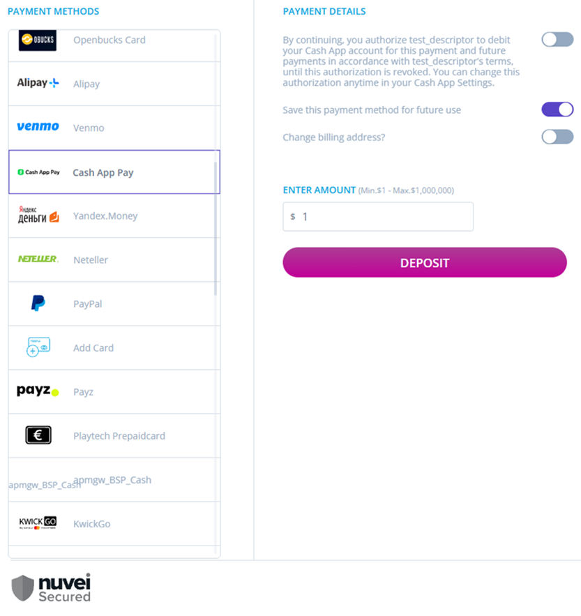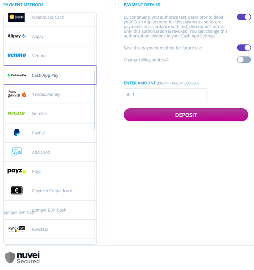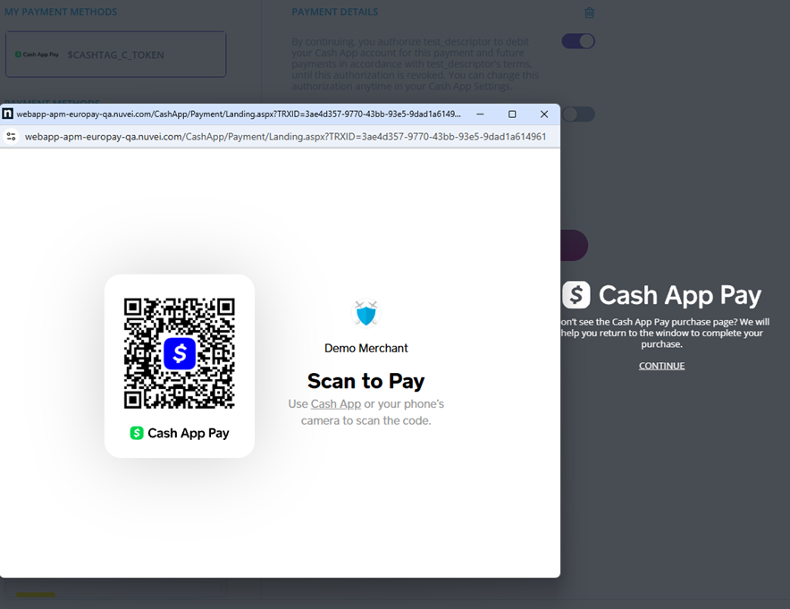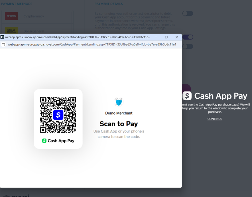 - On the payment page, in ‘Payment Methods’ the user selects the Cash App payment method and in ‘Payment Details’ the user clicks the toggle-switch button to authorize future payments.