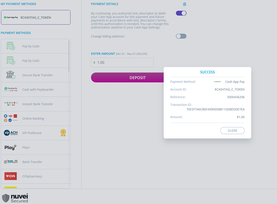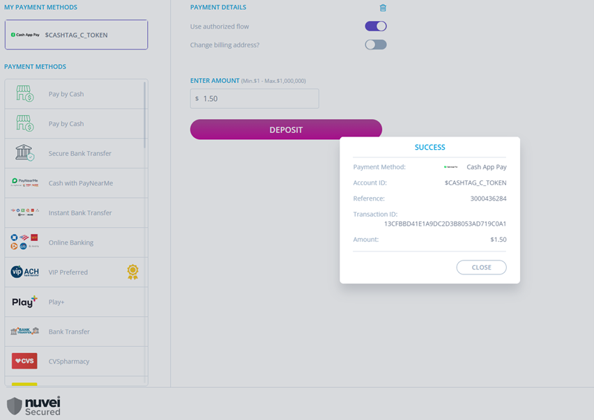 /paymentRequest{ "sessionToken": "282d3fc1e3f3458da86d406d6cfa55510111", "merchantId": "{{merchantId}}", "merchantSiteId": "{{merchantSiteId}}", "userTokenId": "SiltokenRO4021322341", "clientUniqueId": "{{clientRequestId}}", "clientRequestId": "{{clientRequestId}}", "amount": "7", "currency": "USD", "paymentOption": { "alternativePaymentMethod": { "paymentMethod": "apmgw_Cash_App", "cashAppDirectFlow": "true" }, "subMethod": { "subMethod": "RECURRING" } }, "billingAddress": { "firstName": "John", "lastName": "Doe", "email": "[email protected]", "phone": "00359898690366", "dateOfBirth": "1974-04-05", "address": "2992 Cameron Road", "city": "Newark", "zip": "14236", "state": "NY", "country": "US", "language": "en" }, "userDetails": { "firstName": "John", "lastName": "Doe", "email": "[email protected]", "phone": "00359898690366", "dateOfBirth": "1974-04-05", "address": "2992 Cameron Road", "city": "Newark", "zip": "14236", "state": "NY", "country": "US", "language": "en" }, "deviceDetails": { "ipAddress": "192.168.2.38" }, "urlDetails": { "successUrl": "https://apmtest.gate2shop.com/ppp/defaultSuccess.do", "pendingUrl": "https://apmtest.gate2shop.com/ppp/defaultPending.do", "failureUrl": "https://apmtest.gate2shop.com/ppp/defaultCancel.do", "notificationUrl": "https://apmtest.gate2shop.com/ppptest/NotifyMerchantTest" }, "timeStamp": "{{timestamp}}", "checksum": "{{checksum}}" }The response and the DMN include the