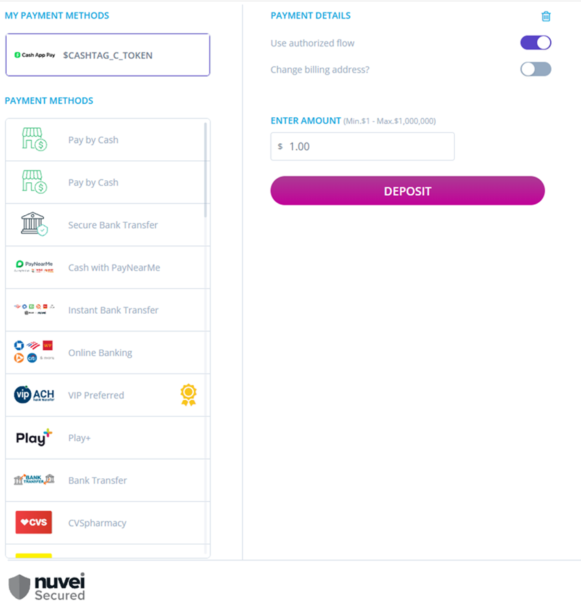 For a returning user, the Cash App payment method is displayed in the ‘My Payment Methods’ section and in the ‘Payment Details’ section; the ‘Use authorized flow’ toggle-switch button is preselected.